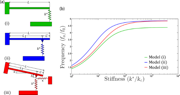 Figure 1: (a) Schematic diagrams of the cantilever models used in determining the dispersion curves to convert measured cantilever oscillation frequency to contact stiffness of the tip–sample contact. Three models are typically used. Model (i) shows the tip at the end of the cantilever, model (ii) shows the tip set back from the end of the cantilever, and model (iii) shows a cantilever tilted with respect to the surface and the tip set back from the end of the cantilever. L is the overall cantilever length, L′ is the distance that the tip is set back from the end of the cantilever, k* is the contact stiffness, α is the tilt angle of the cantilever with respect to the surface, h is the distance between the tip apex and the cantilever base, and κ = 8G*a ([23]) is the lateral stiffness of the tip–sample contact. (b) Dispersion curves providing a lookup table for the conversion of measured resonant frequency to tip–sample contact stiffness. Model (i) is shown in black, model (ii) in blue, and model (iii) in red.